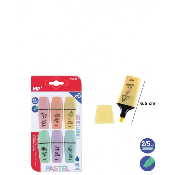 Pack de 6 subrayadores florescentes. De la marca Mp y de tamaño reducido.
